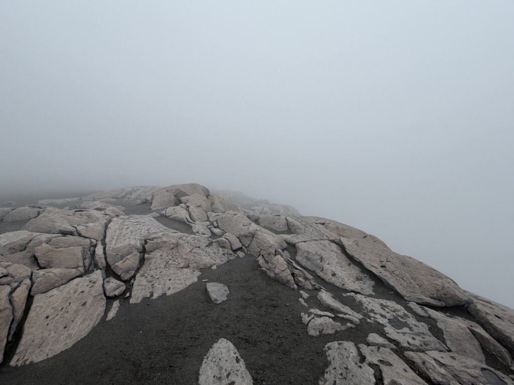 At the very top we are confronted with dense fog, unfortunately. The views are rather grey.